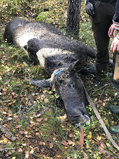 J-O och jag hade turen att se älg på vårt pass och filmen nedan är en filmsnutt av älgtjuren som verkade vara helt förvirrad och som kom tillbaka till vårt pass flera gånger. Nu var det kalv vi skulle skjuta så han hade tur..... i år.